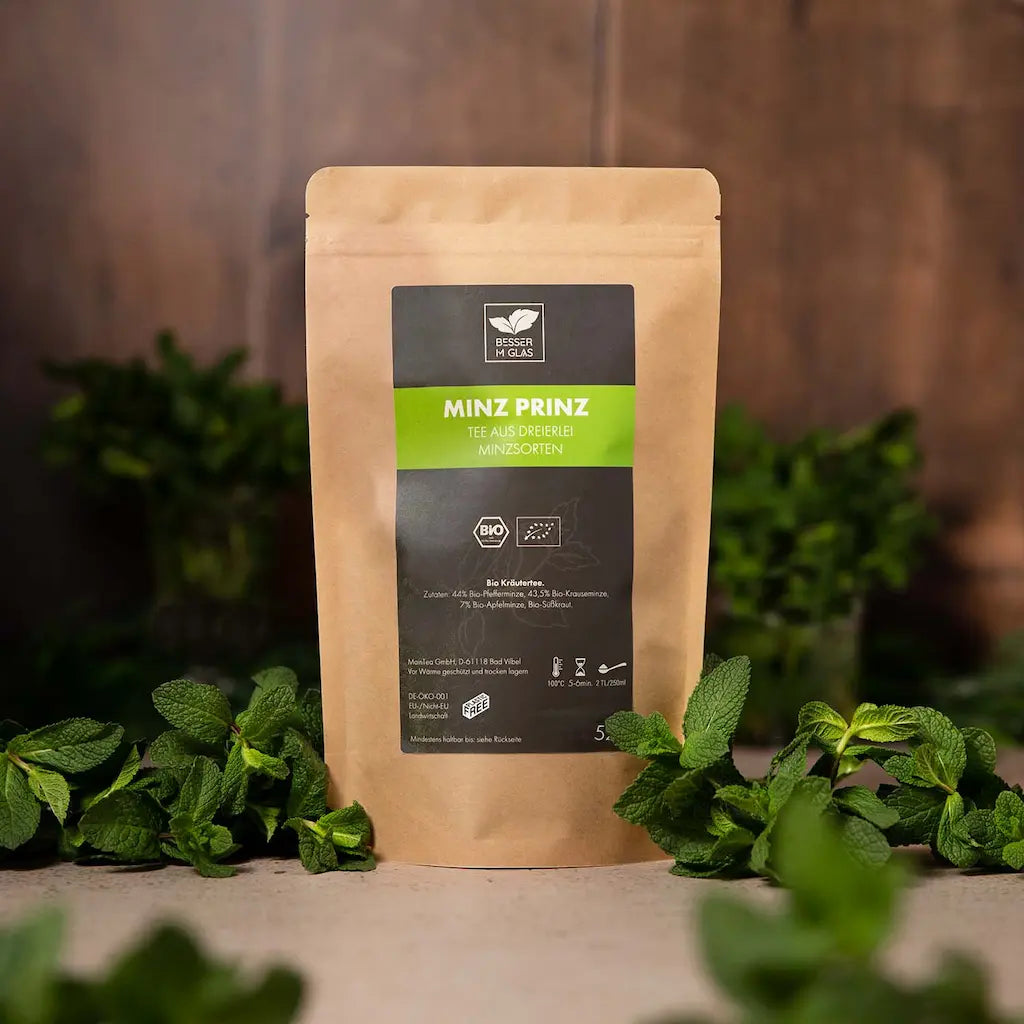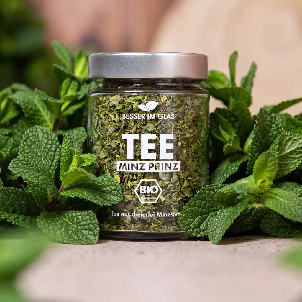 Bio Kräutertee: 44% Bio-Pfefferminze, 43,5% Bio-Krauseminze, 7% Bio-Apfelminze, Bio-Süßkraut